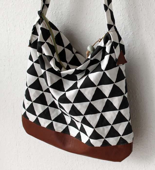 Her er den egentlige grund til indkøb af triangle stof og wanna-be skind. Min nye taske. Syet helt og aldeles på gefühl. Meget meget nem at sy (hvis man lige tænker sig bare en smule om - note to self - gør det næste gang). Det, der tog længst tid, var at få vendt retsiden ud på stroppen! Pille arbejde. Jeg er yderst tilfreds med resultatet. Den er sgu da i al beskedenhed ret go'. Lidt leo, lidt mint, lidt geometri og lidt 'læder'.