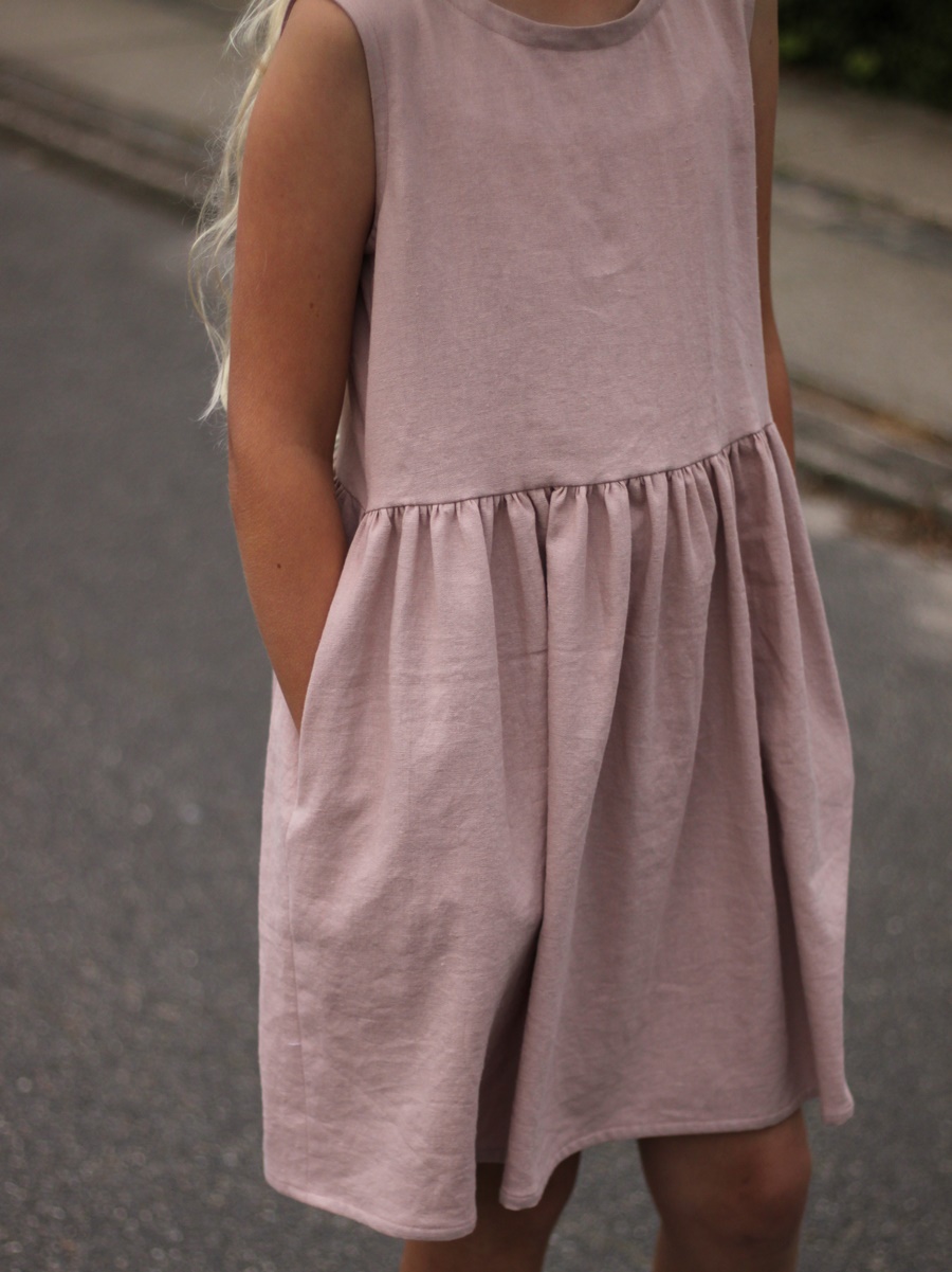 The dress version is actually a lengthened top with the original curved back hem and straight hem front piece with an added gathered skirt. The fabric is a woven crepe with a little stretch. I cut two back pieces as I was planning to make a tiny slit opening at the back neckline, but it turned out that no opening was needed - I can easily pull the dress over my head without (and I could have just cut the back on the fold with this woven version as well).